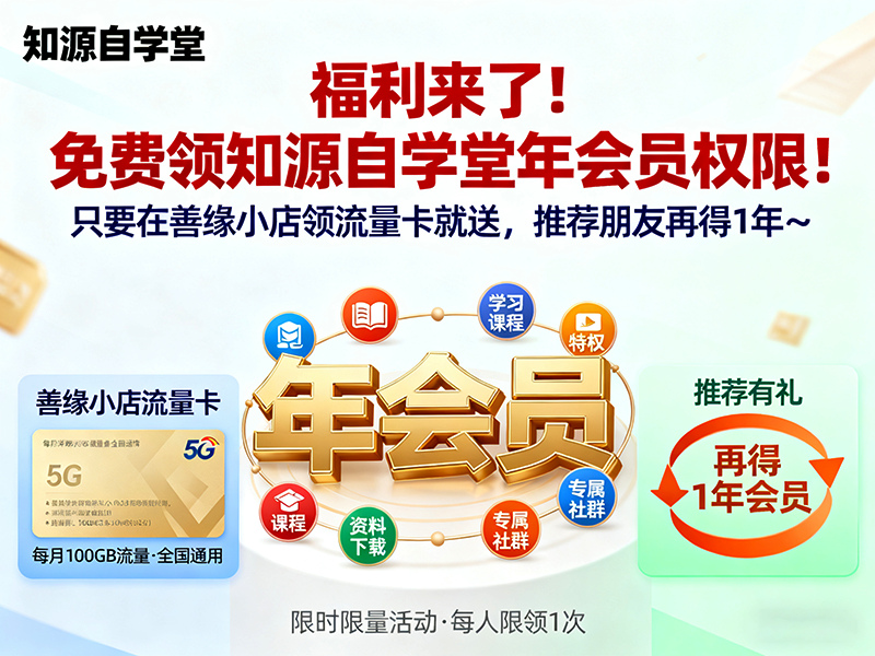 福利来了!免费领知源自学堂年会员权限!只要在善缘小店领流量卡就送,推荐朋友再得 1 年~
